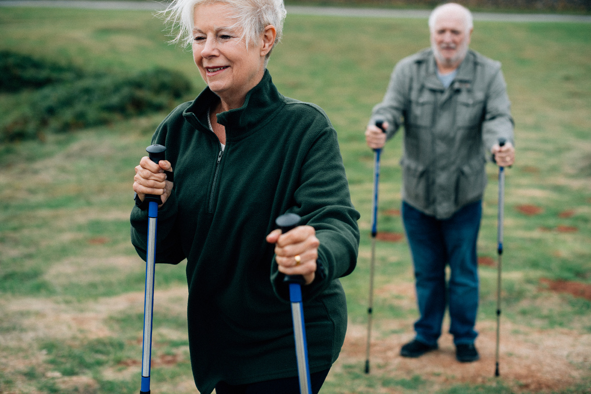 Этот вид нагрузок стал популярным благодаря своей безопасности и эффективности. Пенсионер использует специальные палки, на которые переносит часть веса тела. Это снимает давление с коленей и позвоночника, что особенно важно при артрозах или остеохондрозе. При этом в работу включается верхняя часть корпуса: плечи, спина, руки. Задействуется до 90% мускулатуры. Занятия проходят на улице, поэтому кровь активно насыщается кислородом.