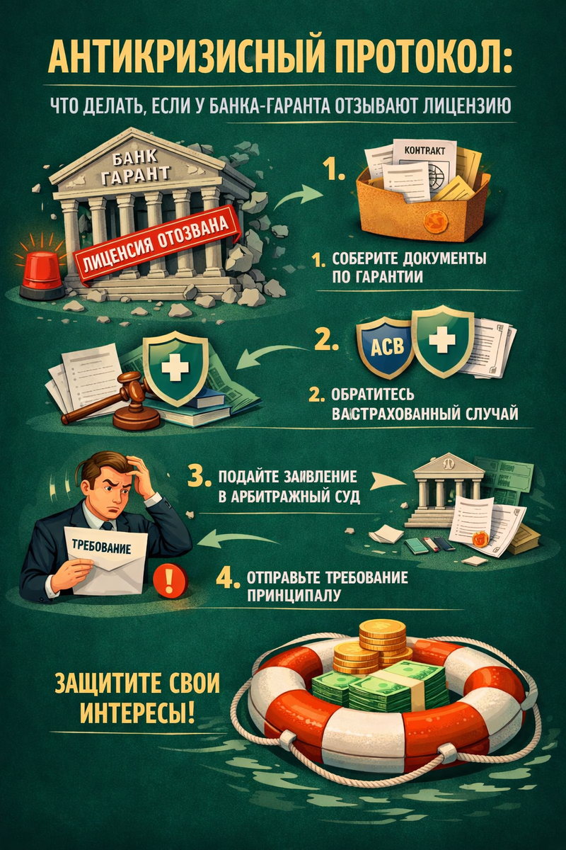 Ваш банк-гарант внезапно оказался в новостях с грифом «отозвана лицензия». Ваша гарантия на 10 млн по госконтракту еще действует. Каковы ваши риски и действия?