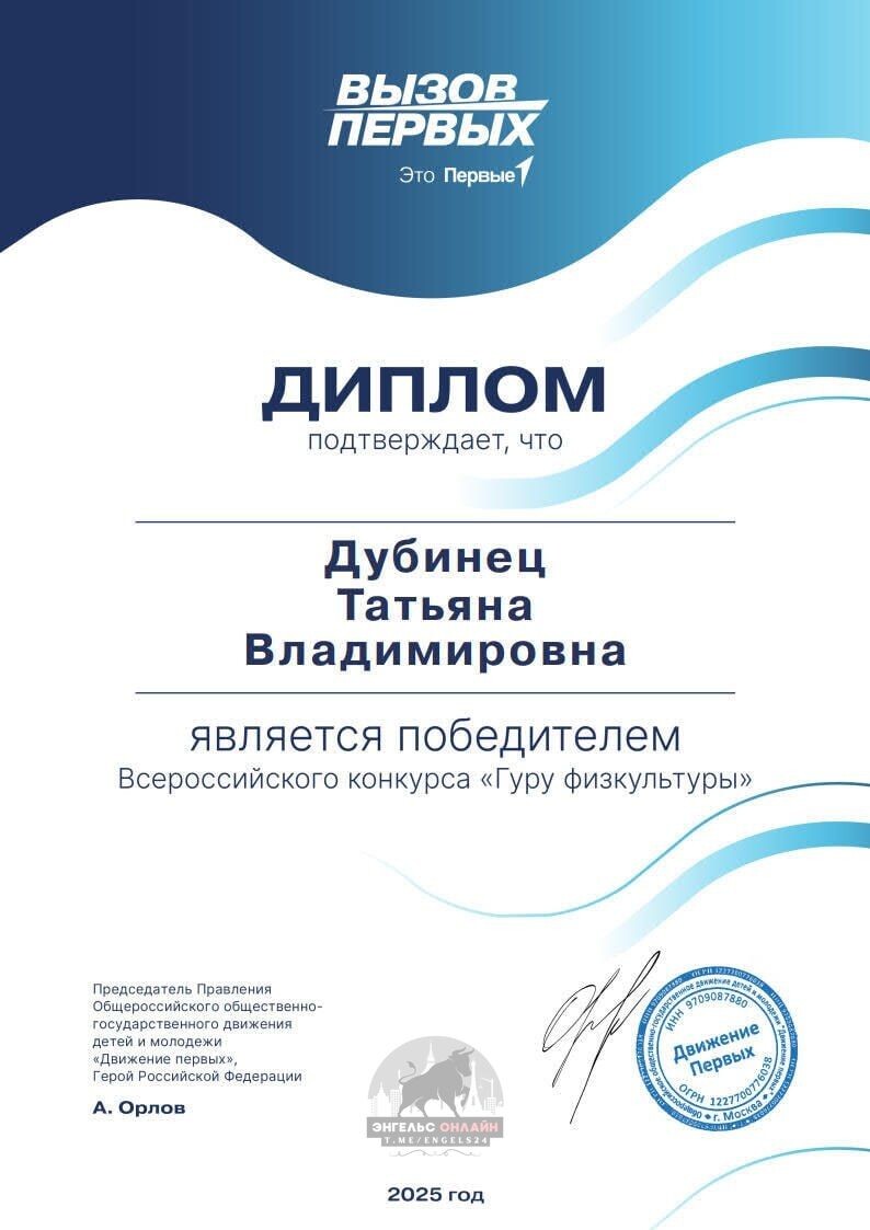" Руководитель физического воспитания Энгельсского промышленно-экономического колледжа Татьяна Дубинец стала победительницей Всероссийского конкурса «Гуру физкультуры», организованного Общероссийским общественно-государственным движением детей и молодежи «Движение первых». Это заслуженная награда подчёркивает высокий уровень профессионализма и преданности делу Татьяны Владимировны. Ее вклад в развитие физической культуры и спорта среди студентов колледжа трудно переоценить. Благодаря энергичным инициативам и увлечению Татьяны Владимировны многие учащиеся активно занимаются спортом, участвуют в соревнованиях и развивают командный дух. ▫️ЭНГЕЛЬС ОНЛАЙН ▪️САРАТОВ ОНЛАЙН 🇷🇺 Мы в мессенджере MAX