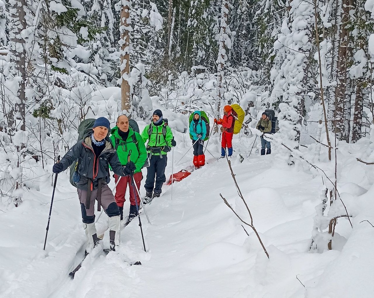 О том, где и как мы тропили лыжню, рассказывает инструкторы Шадрин Юрий и Паюсова Серафима В Ленобласти выпал отличный снежный покров. Собрали группу и отправились в лыжный поход. Главная цель — отработать технику хождения на лыжах и освоить зимний лагерный быт. Все задачи выполнены успешно — рассказываем по порядку! День 1. Встреча на ж/д станции Лемболово. Инструктаж по технике безопасности, раздача снаряжения и продуктов. Надели лыжи и двинулись к приключениям! Сначала шли по снегоходным трассам, затем по маршруту «лыжной стрелы». Сделали привал на обед, отработали спуски и подъёмы. Каждый попробовал волокуши. К вечеру выбрали стоянку и разбили лагерь. Зимний лагерь требует особой подготовки: сначала утоптали площадку под шатёр, выкопали костровую яму, заготовили дрова. Развели костёр, приготовили ужин. Параллельно команда рубит дрова. После ужина установили шатёр — справились за 45 минут благодаря слаженной работе! Установили печь, перенесли дрова внут