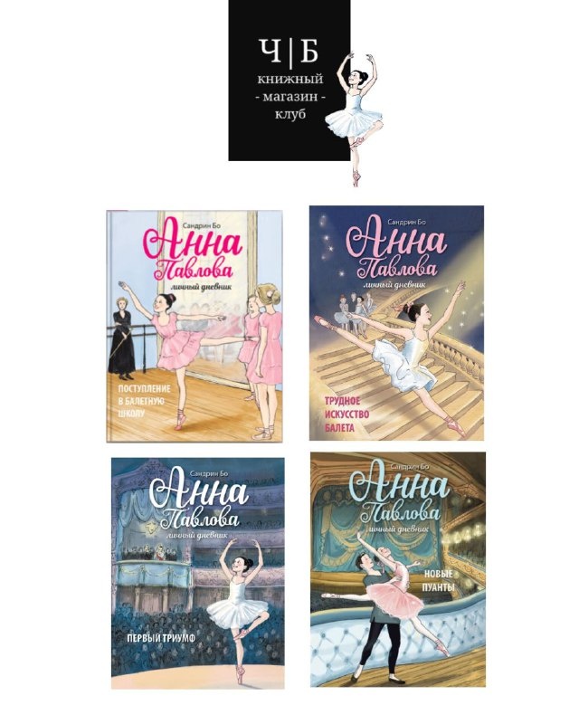 В её честь называли духи, конфеты, десерт, цветы, самолёт и даже местность на планете Венера. Известные композиторы посвящали ей свою музыку, лучшие художники рисовали её портреты. Она стала легендой для всего мира ещё при жизни и до сих пор — столетие спустя — продолжает ей оставаться... Серия "Анна Павлова. Личные дневники балерины" состоит из четырёх книг: Это беллетризованная биография великой русской балерины Анны Павловой. Эмоциональное повествование о ее детстве ведется в форме дневника. Из "Личного дневника" вы узнаете о радостях, горестях и надеждах юной ученицы Императорской балетной школы — будущей великой русской балерины Анны Павловой (1881-1931). В нём описаны достоверные события и реальные исторические личности, однако некоторые эпизоды и персонажи являются художественным вымыслом. Автор книги Сандрин Бо обладательница множества международных литературных премий, в том числе Prix Chronos 2015 во Франции и Prix Chronos 2016 в Швейцарии. Атмосферные иллюстрации швейцарской
