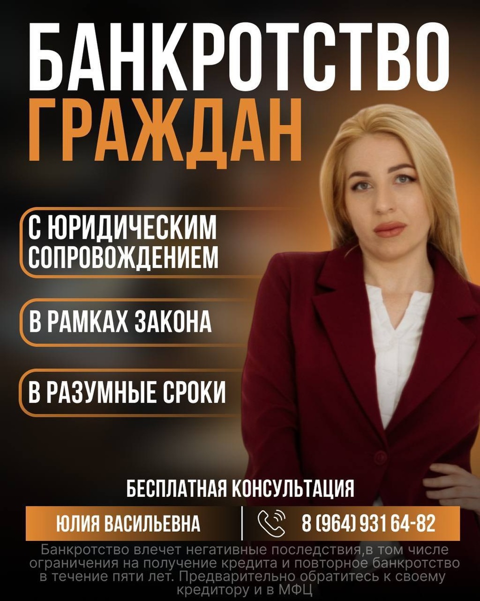 ⬇️ 🙆♀️Оказались в сложной финансовой ситуации: долги,просрочки, пени, штрафы? 🤝Есть разные правовые решения, например банкротство физлиц. Можно пройти процедуру банкротства бесплатно (если подходите под условия) или с моим юридическим сопровождением. ✍️Чтобы узнать подробности и последствия процедуры, записывайтесь на бесплатную консультацию Напишите : Юлия Васильевна ВК: https://vk.com/id444176345 ТГ: https://t.me/Juliabfl Тел: +79649316482 #Реклама ИНН: 370911996536 Степанова Юлия Васильевна *Банкротство влечет негативные последствия, в том числе ограничения на получение кредита и повторное банкротство в течение пяти лет. Предварительно обратитесь к своему кредитору и в МФЦ