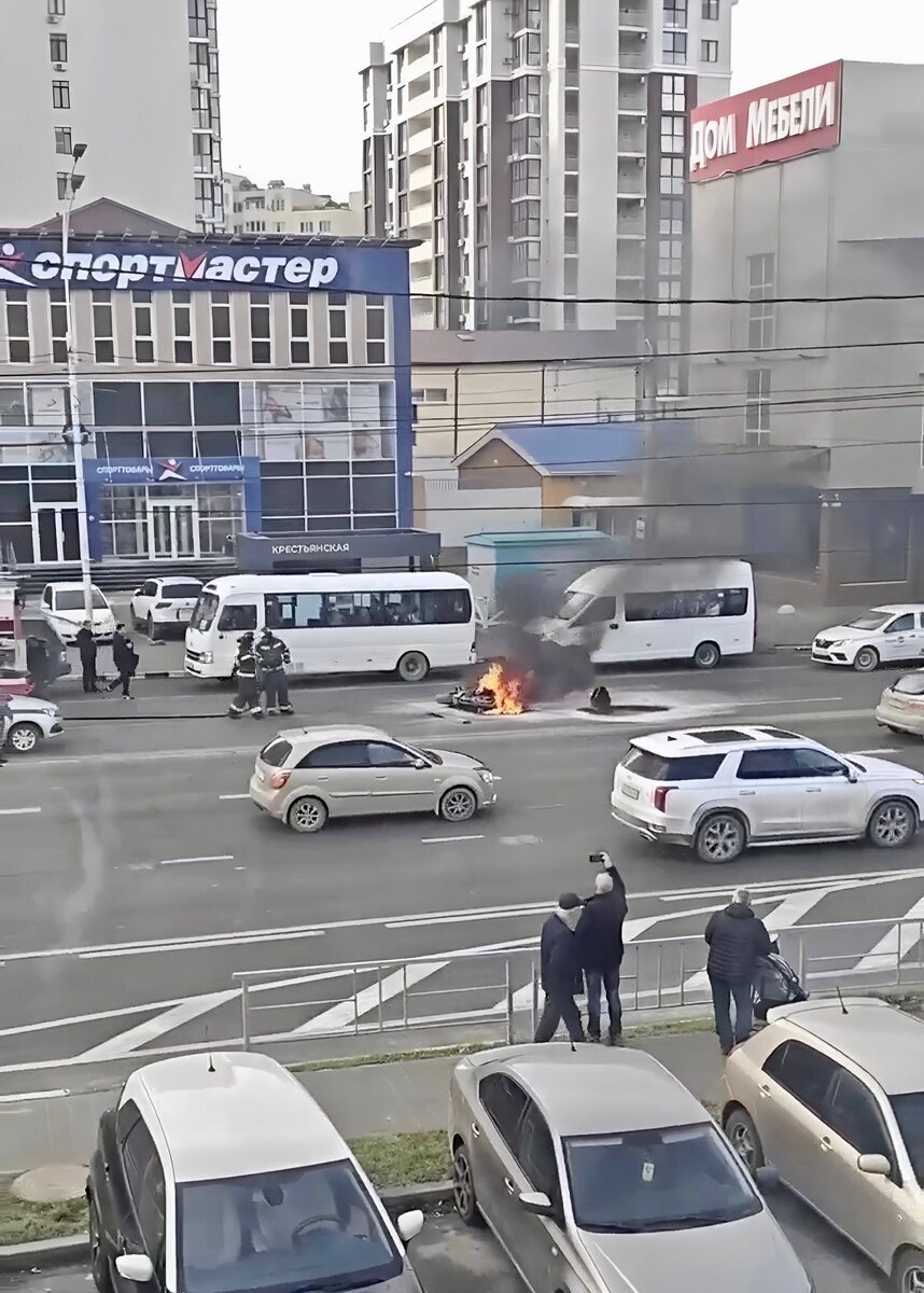 ❕ Очевидцы шокированы: после паузы на светофоре байкер разогнался до 80 км/ч И вдруг — колёса мотоцикла потеряли сцепление с асфальтом. Мужчина вместе с байком рухнул на бок и пролетел до «Газели». Бензин из повреждённого бака моментально растёкся по асфальту, и от искр вспыхнул огненный поток! На место происшествия мгновенно прибыли МЧС, полиция и Росгвардия. Спецтехника боролась с пламенем, а сотрудники огородили опасную зону. В г. Анапа, Симферопольском шоссе образовался серьёзный затор. Напоминаем всем байкерам: контроль скорости и сцепление с дорогой — это жизнь. Один момент невнимательности — и всё может превратиться в огненную трагедию.