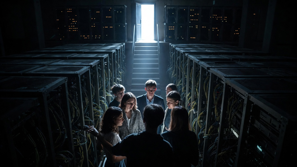 В назначенный день на Утёс приехала редкая по составу делегация: самые старые из живых участников истории. Лера, Кирилл, Яна. Арина встречала их. Никакой церемонии не было. Они спустились в подвал. Прохладное, стерильное помещение, освещённое синим светом светодиодов. Ровный, мощный гул.