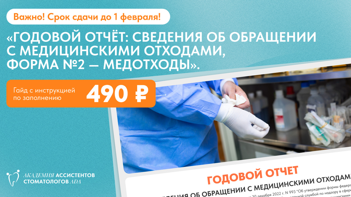 До отправки самого важного отчёта остались считанные дни ❗ Коллеги, а вы уже сдали готовый отчёт по обращению с медицинскими отходами? Если ещё нет, то самое время это сделать: срок сдачи — 1 февраля. А с нашим гайдом вы сможете: ✅ грамотно и быстро заполнить отчёт; ✅ подготовиться к проверке Роспотребнадзора/Росздравнадзора; ✅ обеспечить безопасность себе и персоналу — своевременная сдача отчётов закрывает 90 % проблем. Правила и нормы заполнения данного отчёта меняются редко, поэтому гайд останется с вами на долгие годы. Цена: 490 ₽. Забирайте гайд по ссылке — будьте готовы к любой проверке!