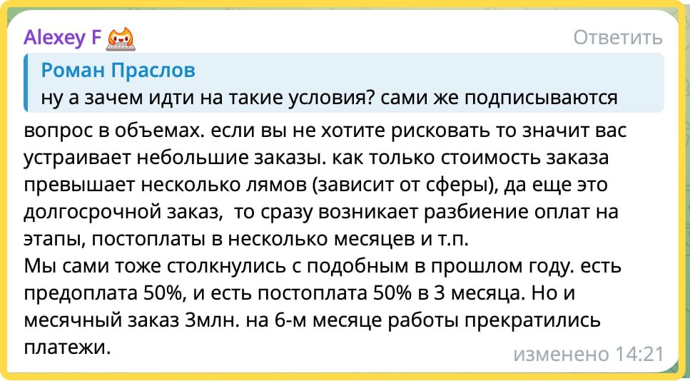 Может быть все отлично очень долго, вы привыкаете, а потом заказчик тянет с оплатой, но отмечает - ведь до этого год работали, и этот долго погасим. В итоге вы верите, работаете, работаете... А долг растет. И в какой-то момент вы прекращаете работу, а заказчик говорит - дружище, но ты же понимаешь, что в таком случае мы тебе никогда не заплатим, ибо ты повел себя по отношению к нам не очень красиво :) Вы думаете я фантазирую? Да ладно. Такое сплошь и рядом. Да и мы вляпывались не раз в такую проблему :) Русский ИТ бизнес