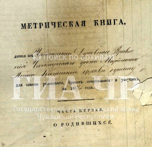 Метрические книги о рождении, браке и смерти за 1857 г. 1 января 1857 — 31 декабря 1857 ГИА Чувашской Республики (ГИА ЧР), фонд № 225, опись № 3, дело № 126, стр. 620 скан. Метрическая книга, данная из Чебоксарского духовного правления в Чебоксарского уезда Мариинского Посада Казанской церкви для записки родившихся, браком сочетавшихся и умерших, на 1857 год. Часть первая. О родившихся. Стр. 624 скан. Март. № 13. 17 числа родился. 19 числа крещен. Алексей. Родители: Владимирской губернии Судовотского уезда деревни Каревой господина Поташева крестьянин Максим Григорьев и законная жена его Евдокия Иванова, оба православного вероисповедания. Восприемники: Мариинского посада мещанин Михаил Львов Дубов, и города Цивильска 3-ей гильдии купца Софрона Тимофеева Забродина жена Александра Ефимова. Таинство крещения совершил Гурий Васильев Покровский. Дьячек Михаил Феодоров Парисов. Пономарь Прокопий Борисов. https://yandex.ru/archive/catalog/aa3f6ea2-fec0-4ec6-b080-34d7259ef244/624