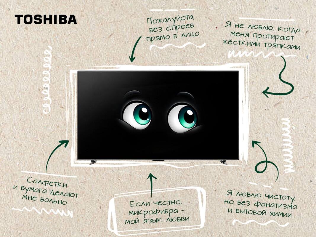 фильмы и сериалы. И это правда! Теперь можно закрыть этот вопрос на долгие годы 💆♂️💆♀️ Но чтобы телевизор радовал качественной картинкой как можно дольше, ему нужен простой, но правильный уход. Один случайный «не тот» протирочный жест, конечно, не станет катастрофой, но регулярные ошибки могут со временем сказаться на экране и его внешнем виде. Поэтому сохраните список того, чего лучше избегать: 1. спирт и средства на его основе 2. порошки и очистители для стёкол 3. бумажные салфетки и полотенца 4. обычные влажные гигиенические салфетки А вот что телевизор оценит по-настоящему: 1. мягкую тряпку из микрофибры 2. специализированные салфетки для экранов 3. гели и аэрозоли, предназначенные для электроники Небольшая забота, и ваш ТВ будет радовать вас отличным изображением ещё много лет 🙌 #ToshibaTV #Toshiba #телевизор @toshiba_russia
