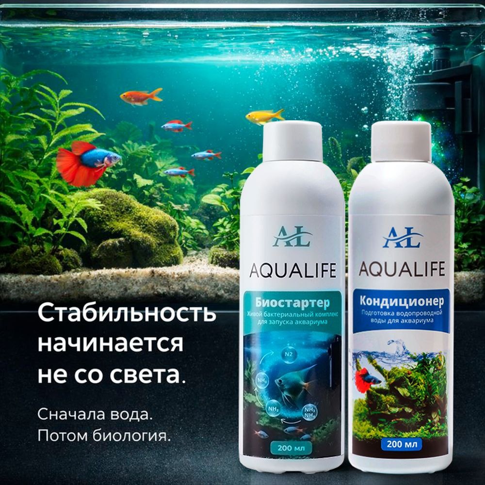 ? Чаще всего проблема не в свете и не в удобрениях, а в том, с какой воды начинается система. Водопроводная вода для нас выглядит нормальной, но в ней содержится остаточный хлор, тяжёлые металлы, а параметры не всегда нестабильны. Если в такую воду сразу добавить биостартер, то часть бактерий просто не включается в работу. Если посадить растения, то они получают стресс ещё до начала роста. Правильная логика запуска травника простая: 1️⃣ Кондиционер. Убирает хлор и металлы, делает воду безопасной для растений и бактерий. 2️⃣ Биостарт. Быстро заселяет фильтр и грунт, запускает азотный цикл и не даёт органике выйти из-под контроля. Исправлять ошибки запуска аквариума в плотных травниках обходится очень дорого. Связка кондиционер + биостарт помогает контролировать запуск, для травников главное стабильность, а не скорость. Купить AquaLife Кондиционер на Wb Купить AquaLife Кондиционер на Ozon Купить AquaLife Кондиционер на Яндекс Маркете Купить AquaLife Биостарт на Wb Купить AquaLif