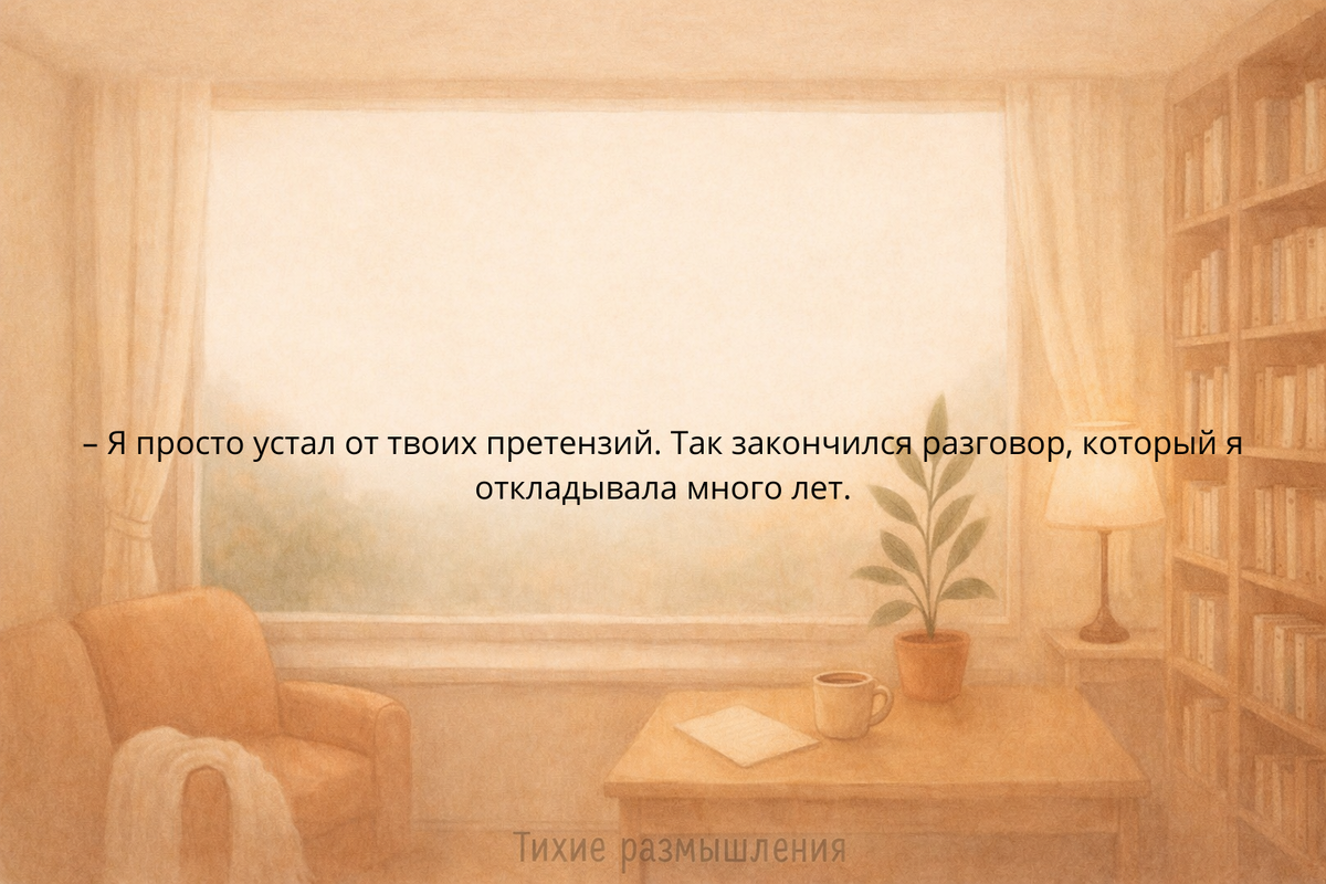 Всё, что я копила годами, что хотела высказать, разбилось об стену его равнодушия. Он не услышал. Не захотел услышать. Для него я просто надоедливая жена, которая пристаёт с претензиями.