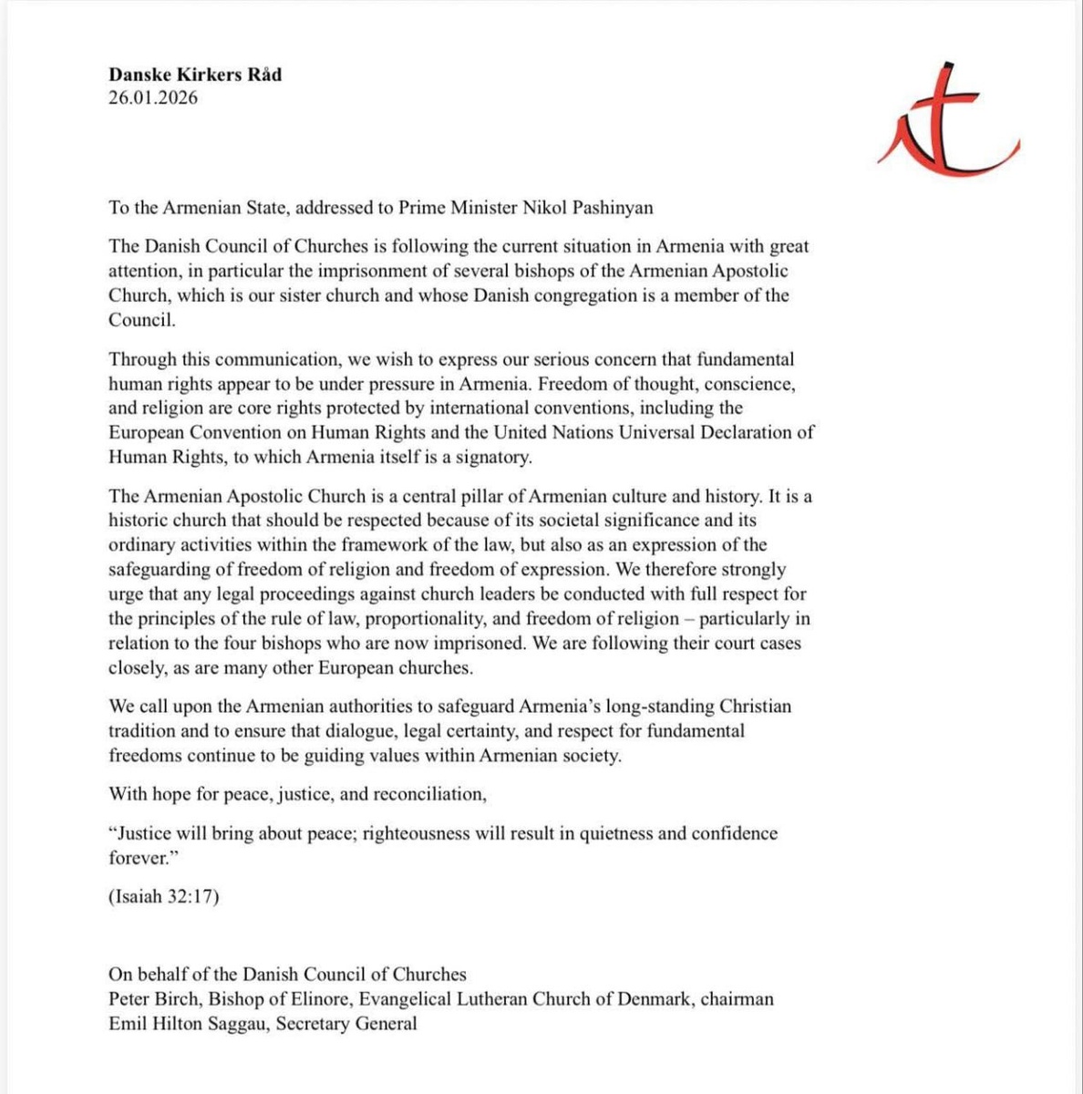26.01.26 ____ Դանիայի Եկեղեցիների Խորհուրդը մեծ ուշադրությամբ հետևում է Հայաստանում ստեղծված ներկա իրավիճակին, մասնավորապես՝ Հայ Առաքելական Եկեղեցու մի քանի եպիսկոպոսների կալանավորմանը։ Հայ Առաքելական Եկեղեցին մեր քույր եկեղեցին է, Դանիայի Հայ Առաքելական եկեղեցին՝ մեր Խորհրդի անդամ։ Սույն գրությամբ մեր խորը մտահոգությունն ենք հայտնում առ այն, որ Հայաստանում, ըստ երևույթին, ոտնահարվում են մարդու հիմնարար իրավունքները։ Մտքի, խղճի և կրոնի ազատությունը հիմնարար իրավունքներ են, որոնք պաշտպանված են միջազգային կոնվենցիաներով, այդ թվում՝ Մարդու իրավունքների եվրոպական կոնվենցիայով և ՄԱԿ-ի Մարդու իրավունքների համընդհանուր հռչակագրով, որոնք վավերացվել են նաև Հայաստանի Հանրապետության կողմից: Հայ Առաքելական Եկեղեցին հայ ժողովրդի մշակույթի և պատմության առանցքային սյուներից մեկն է։ Այն պատմական եկեղեցի է, որի հանդեպ պետք է հարգանք տածել հասարակության մեջ իր նշանակության և օրենքի շրջանակներում իրականացվող գործունեության համար, ինչպես նաև որպես կրոնի ազատության և խոսքի ազատության պահպանման արտահայտո