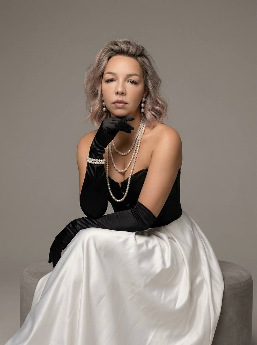 ✨Переходим на удобный сервис для генерации: Ссылка 👉 Syntx Ai Ссылка 👉 Veo3 📌ИНСТРУКЦИЯ ПО ИСПОЛЬЗОВАНИЮ В ЗАКРЕПЛЕННЫХ СООБЩЕНИЯХ ◾️ПРОМТ : Не меняй черты лица. Фотореалистичный студийный fashion‑портрет в стиле old‑money / editoral. Одна девушка (я), сидит в 3/4 развороте на низком пуфе/кресле, поза элегантная: одна рука согнута и опирается на колено, кисть у подбородка; вторая рука лежит вдоль колена. На ней чёрный корсет/бюстье без бретелей, длинные чёрные атласные перчатки выше локтя, пышная белая сатиновая юбка с мягкими складками и бликами. Многослойные длинные жемчужные бусы каскадом, жемчужные серьги‑капли, жемчужный браслет. Волосы, короткие, но густые, с объемом у Корней, с лёгкими локонами.. Фон — ровный серый seamless (гладкая студийная стена), минимализм, без реквизита. Свет — мягкий студийный ,, деликатные тени, высокий уровень детализации ткани (сатин/атлас), безупречная кожа,нюдовый макияж. Камера: 85mm, f/2.8, лёгкое боке, кадр по пояс/ниже, много “воздуха”