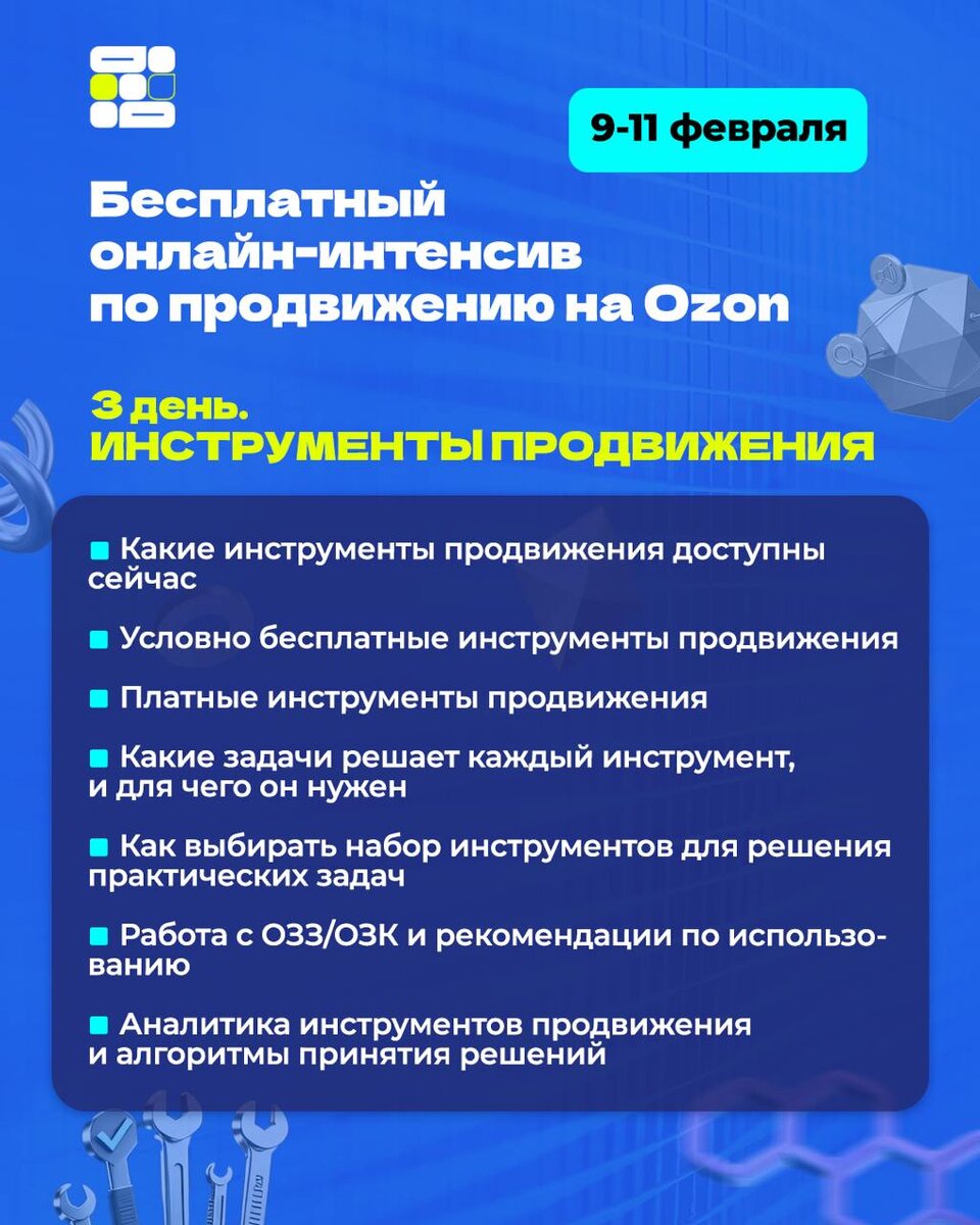 На третий день нашего бесплатного онлайн-интенсива обсудим инструменты продвижения на Ozon. 🎓 Разберём инструменты продвижения, которые реально работают сейчас. Что можно делать без бюджета, куда имеет смысл вкладываться, а куда нет. Как подобрать связку инструментов под конкретную задачу. И как читать аналитику, чтобы принимать решения на основе цифр, а не вслепую. 📅 9–11 февраля, в 19:00 по МСК 😍 Участие бесплатное. 🙌 Чтобы попасть на интенсив, вступите в канал по ссылке — все подробности и ссылки на трансляции опубликуем там.