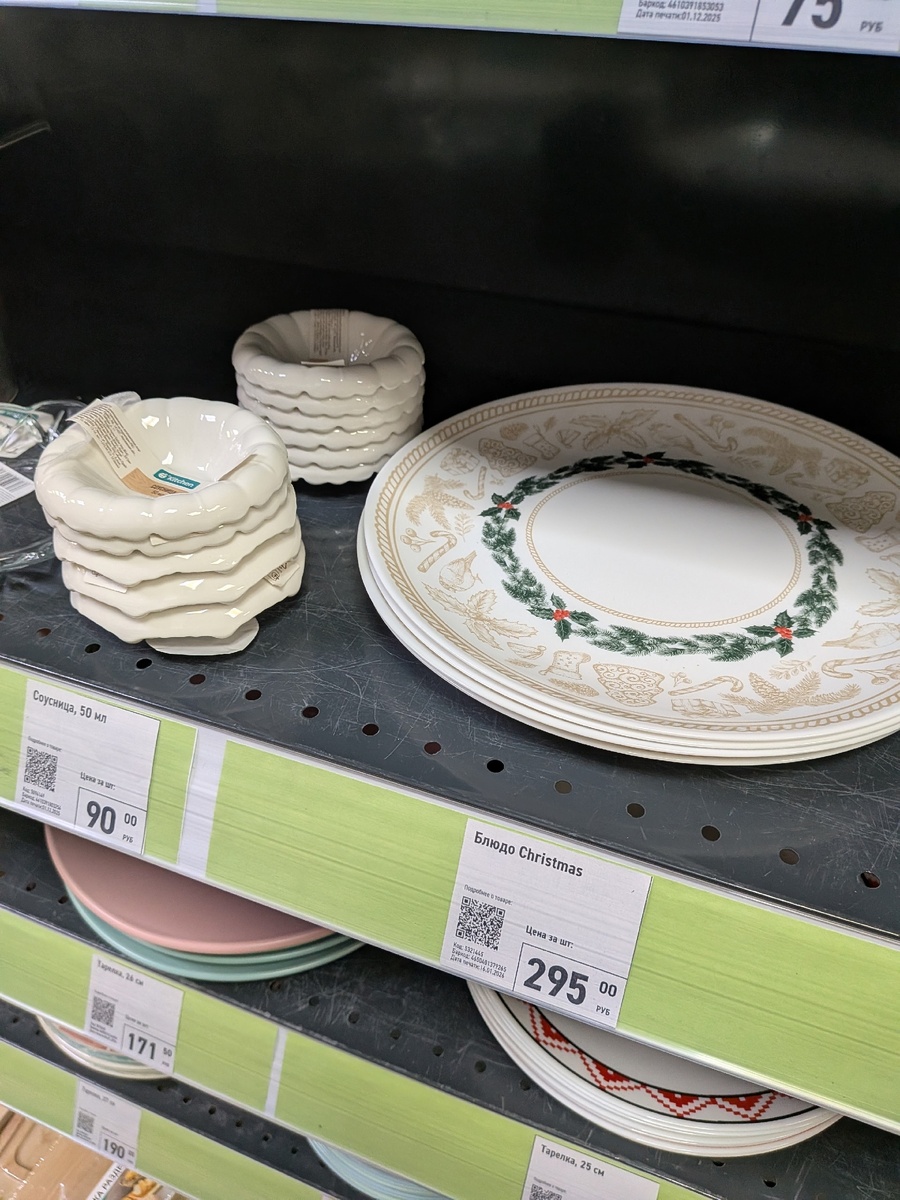 Никогда бы не подумала, что меня позовут именно в "FixPrice" и именно ради того, чтобы приобрести различные азиатские сладости и лапшу, однако именно из-за этого приехавшая после сессии племянница и отправила нас всех в магазин. А я что, я только рада посмотреть что-то новое, тем более относительно давно меня не было в этой сети магазинов - новинок и вправду нашлось довольно много. Захотелось мне и с вами ими поделиться, обсудить, а то ж так с первого взгляда и непонятно - стоит ли тратиться или лучше проходить мимо. На всякий случай напомню момент с тем, что из-за крайнего севера цены у нас в городе повыше, чем во многих других, поэтому, если вы проживаете не на севере, предполагайте, что вы потратите на покупки меньше. Давайте перейдем уже к тем самым новинкам: Я уж точно не смогла бы пройти мимо посуды, потому с нее мы и начнем наше обсуждение. Не знаю как раньше не замечала, но в магазине есть тарелки из новогодней коллекции. Стоят они 295 рублей, сами по себе плоские, но довольно