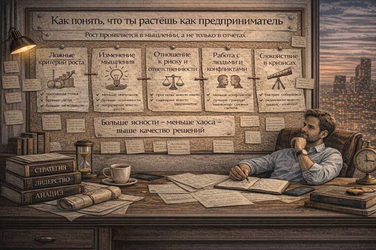 Рост предпринимателя часто пытаются измерить цифрами: выручкой, масштабом команды, количеством проектов. Эти показатели важны, но они вторичны. Настоящий рост происходит не в отчётах, а в мышлении. И именно его сложнее всего заметить — и ещё сложнее честно признать. 🧭 Ложные критерии роста В предпринимательской среде укоренились простые и удобные маркеры успеха: больше денег; больше клиентов; больше задач; больше ответственности. Проблема в том, что всё это может расти и без внутреннего развития. Можно зарабатывать больше, оставаясь в том же уровне мышления. Можно управлять большим бизнесом, продолжая принимать импульсивные решения. Можно масштабироваться — и выгорать. Ложный рост часто выглядит так: постоянная гонка без ощущения устойчивости; рост оборота при падении качества решений; расширение бизнеса без роста внутреннего спокойствия. Если рост создаёт только напряжение — это не рост, а раздувание системы. 🧠 Изменение мышления и реакций Один из самых точных признаков рост