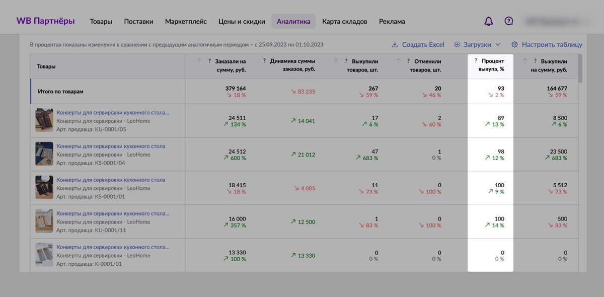 Чтобы процент выкупов оставался на высоком уровне, нужно правильно управлять ассортиментом. Помогут инструменты в личном кабинете на WB или специальные сервисы аналитики для маркетплейсов.