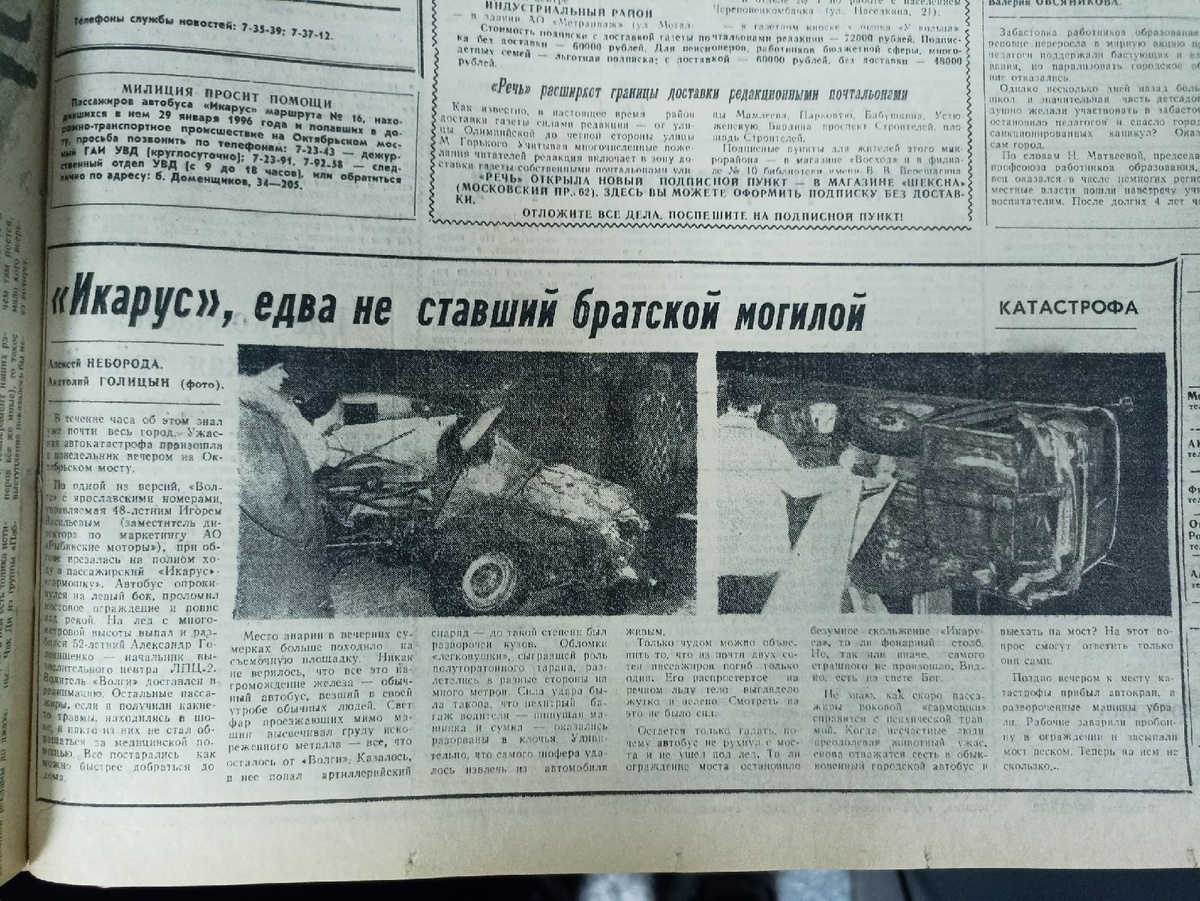 В течение часа об этом знал уже почти весь город. Страшная автокатастрофа произошла 29 января 1996 года около 17 часов на Октябрьском мосту. При обгоне «Волга» с ярославскими номерами врезалась в «Икарус»-«гармошку». Переполненный автобус лег на левый бок и пробил ограждение моста. Передняя его часть повисла в воздухе. Только чудом автобус не свалился в реку. У «Икаруса» вылетели стекла, и один из пассажиров выпал на лед. 52-летний Александр Голенищенко, начальник вычислительного центра ЛПЦ-2, погиб. Остальные пассажиры находились в шоке и постарались быстрее добраться до дома. «Место аварии в вечерних сумерках больше походило на съемочную площадку. Никак не верилось, что все это нагромождение железа – обычный автобус, везший в своей утробе обычных людей… Только чудом можно объяснить, что из почти двух сотен пассажиров погиб только один. Остается только гадать, почему автобус не рухнул с моста и не ушел под лед».
