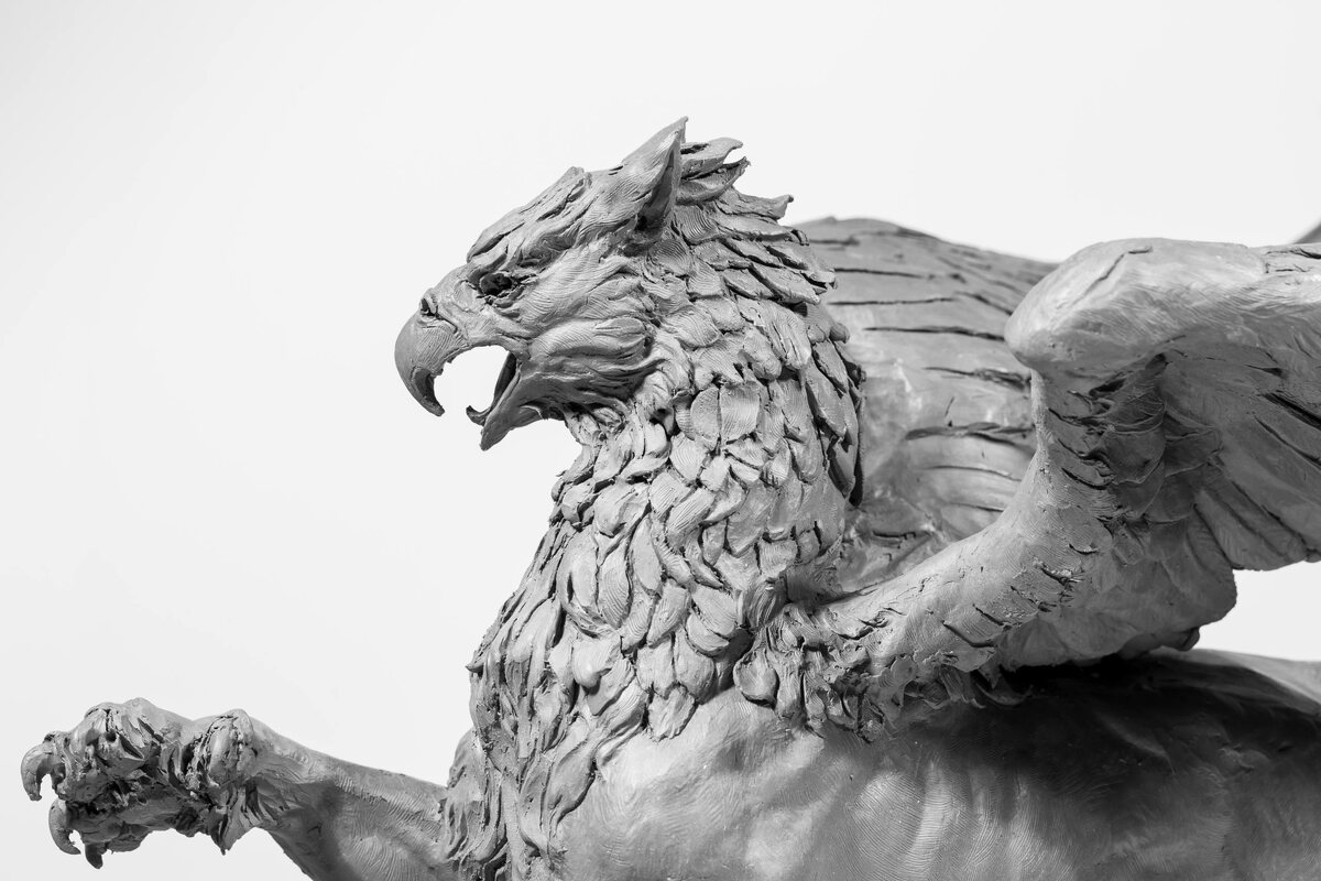 пластилин Высота -28 см 2026 г Грифоны — мифические крылатые существа с туловищем льва и птичьей головой (головой орла). Античные авторы писали, что у грифонов большие острые когти, мощный клюв, а перья могут быть золотого или белого цвета. В мифах и легендах разных традиций грифон Выступает в роли стража. Например: - охраняет пути к спасению, располагаясь рядом с Древом Жизни; - стережёт сокровища или сокровенное, тайное знание. Образ грифонов встречается в разных контекстах, например: В геральдике — грифон часто встречается в гербах, символизирует могущество, власть, бдительность, быстроту и силу.
