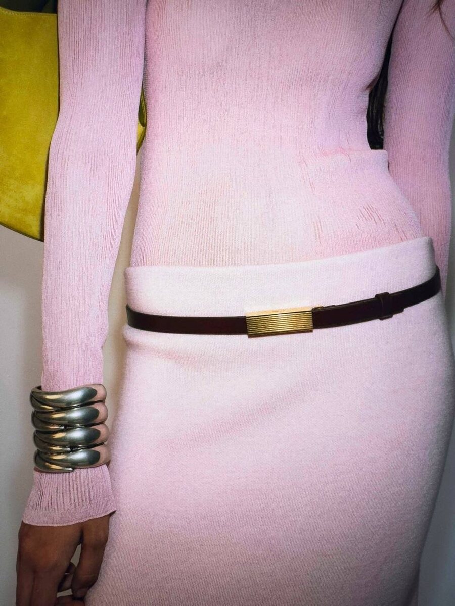 Забудьте про брюки на низкой посадке. Самый трендовый способ нарушать пропорции — носить ремень на бедрах.