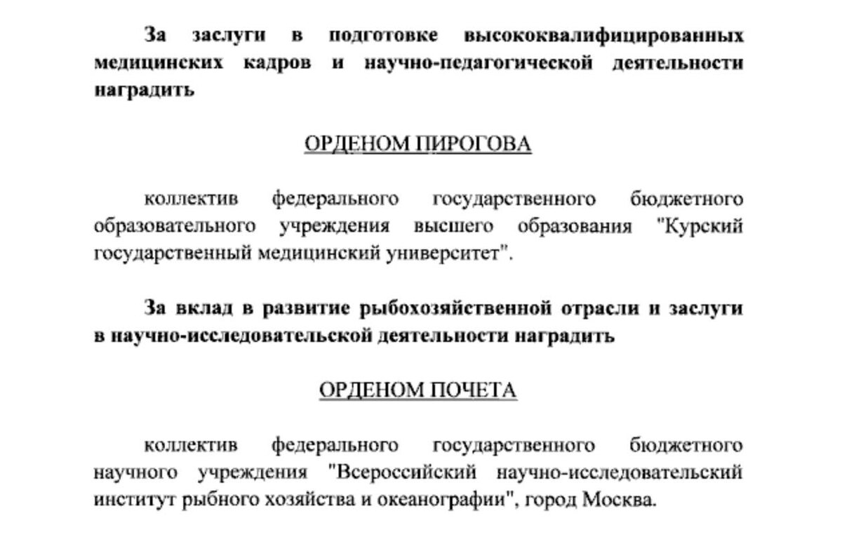 ❗️Президент Владимир Путин подписал Указ от 28.01.2026 №36 «О награждении государственными наградами». ➡️Ряд наград получили научно-образовательные институты. 1️⃣За заслуги в подготовке высококвалифицированных медицинских кадров и научно-педагогической деятельности Орденом Пирогова награжден коллектив Курского медицинского университета. 2️⃣Орден Почета за вклад в развитие рыбохозяйственной и заслуги в научно-исследовательской деятельности вручен коллективу ВНИИ рыбного хозяйства и океанографии. 3️⃣За большой вклад в развитие отечественной науки и образования, подготовку высококвалифицированных специалистов Орденом «За доблестный труд» удостоен коллектив МГТУ им. Н.Э.Баумана. 🔗Подробнее. #новостиНОП 📱 НОП - Научно-образовательная политика