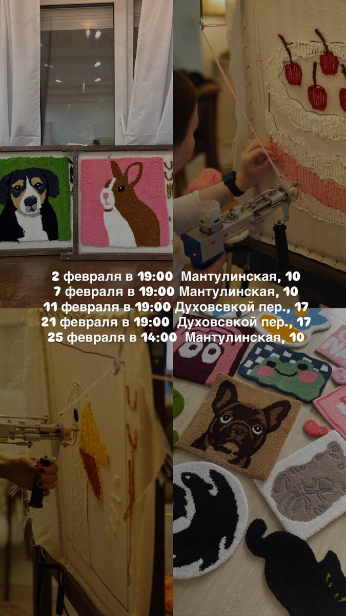 ❄️ Дорогие жители и гости столицы, приглашаем вас на наш творческий мастер-класс по созданию ворсового коврика 🧶 Мастер-класс длится 2,5-3 часа - за это время с помощью специального инструмента мы забиваем пряжу в полотно, делаем коврик своими руками и просто весело проводим время. Эскизы вы выбираете сам 👀 Записаться в студию My hygge place (Мантулинская, Духовской переулок) Записаться в студию Clio (Космодамианская набережная)