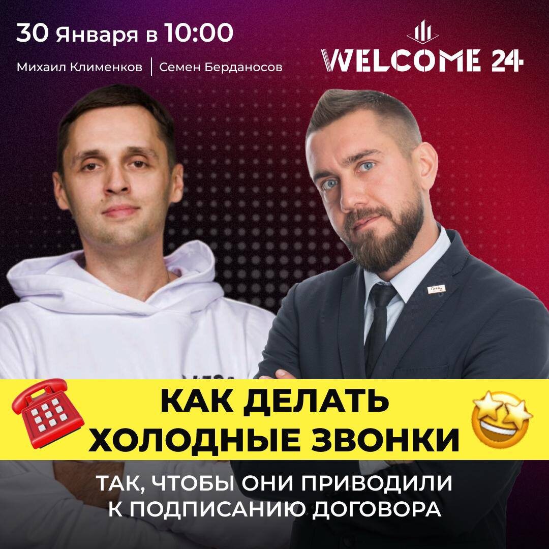 … …выводить потенциального клиента путем переговоров на подписание договора – это навык, который можно прокачать 🔥 Уже завтра в 10:00 по мск мы проведем вебинар на тему: «Как делать холодные звонки так, чтобы они приводили к подписанию договора» 🗣️Спикеры: — Михаил Клименков, CEO WELCOME 24 — Семён Берданосов, один из самых неординарных наставников по продажам, 10+ лет в недвижимости, обучил зарабатывать 500+ агентов 📍 Вебинар пройдет в Яндекс Телемост, ссылку оставим перед началом Этот эфир станет твоей точкой роста, не пропусти🔥