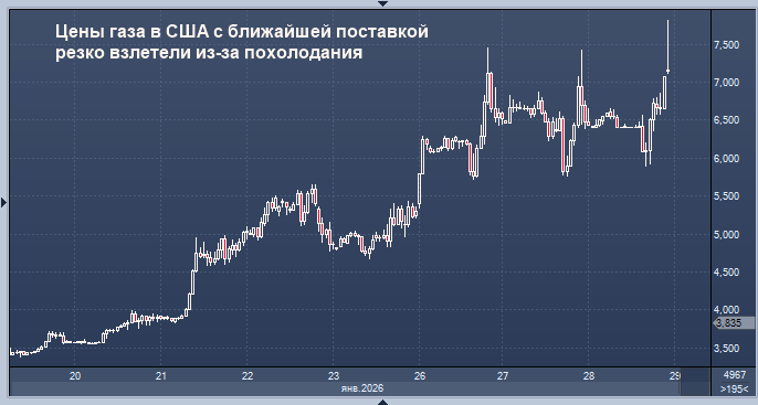 Контракт, который уже истек, пережил головокружительный рост цен. Рост цен на газ в США подстегивает импорт СПГ вместо экспорта, отмечают в Газпроме График цены газа с поставкой в ноябре на бирже в Нью-Йорке интервалами в 60 минут (в $/млн БТЕ) См. график фьючерсов на природный газ в Европе "Цены на газ в США продолжают расти. 28 января цена на Henry Hub "на месяц вперед" достигла $263,3 за тыс. куб. м (рост на 7% за день)", - отметили эксперты в Газпроме, которых цитирует Интерфакс."Некоторые компании на фоне рекордных цен импортировали СПГ в США. Это усугубляет ситуацию для европейского газового рынка, для которого США становятся не только основным поставщиком, но также и конкурентом за свободный ресурс в период пикового спроса", - отмечают российские эксперты. В минувшие выходные зимний шторм «Ферн» обрушился на центральную часть США и Восточное побережье, принеся с собой сильные снегопады и гололед. Эти экстремальные погодные условия привели к резкому росту цен на газ из-за увеличе