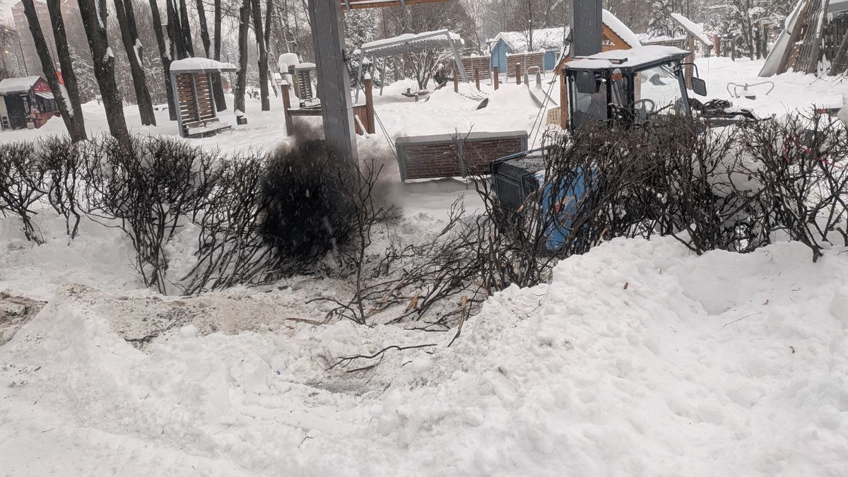 : В Мытищинском парке, на площадке у аттракционов, трактор убирал снег и переехал несколько кустов, при этом застрял и пытался проехать дальше, через лавочки🤦