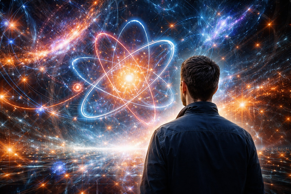Ваше тело, в частности рука, которая держит гаджет, - это на 99,9999 % пустота. Если бы атомы были увеличены до размеров стадиона, то их ядро было бы размером с муху, а электроны находились бы на самых дальних трибунах. Между ними - только вакуум. Однако вы не проваливаетесь сквозь пол благодаря силам, которые отталкивают атомы вашего тела от атомов стула, создавая иллюзию «твёрдости». Материя - это не плотное вещество, а энергия, которая вибрирует в пустоте, создавая форму, лишь когда на неё обращают внимание. Квантовая физика разрушает привычное восприятие частиц как твердых объектов, показывая их как размытые облака вероятностей, которые становятся «существующими» только при наблюдении.