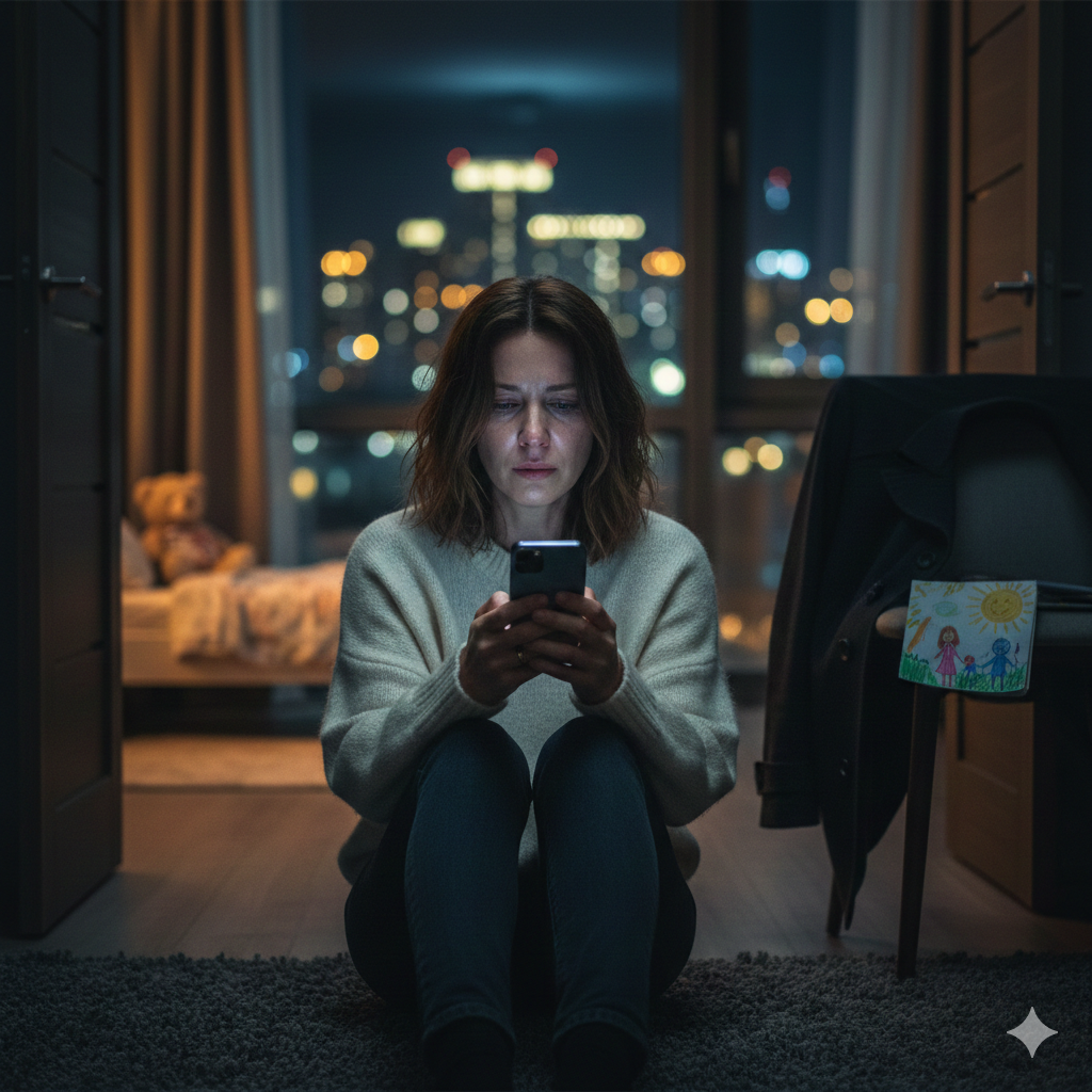 Тишина в квартире была такой плотной, что её, казалось, можно было потрогать руками. Тёма давно спал, обнимая плюшевого мишку, а Елена сидела на полу в гостиной, глядя на экран телефона. Ни одного пропущенного, ни одного сообщения. Пустота.