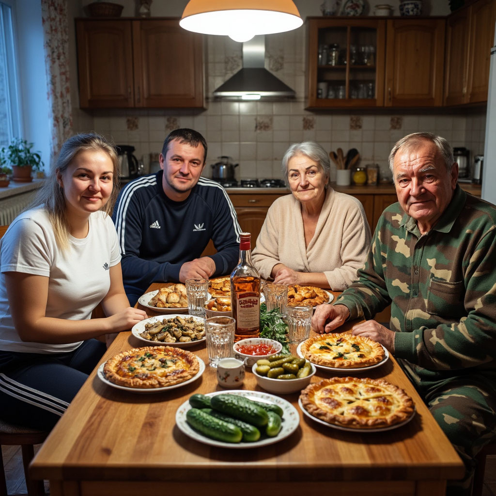 - Ну что, невестушка, чем порадуешь? - громогласно вопросил свекр, выставляя на стол баночку пупырчатых огурцов и бутылку домашней самогонки.