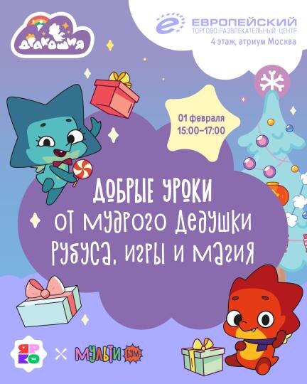 🗓 1 февраля с 15:00 до 17:00 💸 бесплатно 📍 ТРЦ «Европейский», 4 этаж, Атриум: Москва Игровая программа: • Игра «Дракошная магия» • Игра «Облачные скульптуры» • Игра «Дракошные блинчики» • Дракошные викторины • Шоу мыльных пузырей от Тоши А ещё блеск-тату «Облака» и Мастерская от Мисоли, где мы будем собирать магические амулеты «Волшебная пыльца» ➡️ ПОДРОБНОСТИ ⬅️ ❗️ Москва для детей