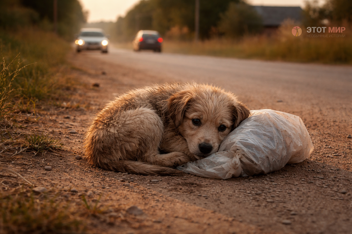Щенок тихо поскуливал, свернувшись калачиком возле старого пакета из супермаркета на обочине дороги, недалеко от посёлка Клёновая Гряда — места, будто застывшего в знойной тишине позднего лета. Мимо с шорохом проносились машины, и их длинные тени скользили по пыльному, дрожащему телу. Его слипшаяся от пыли шерсть и лапы, сбитые до крови после дней бесцельных скитаний, говорили о тяжёлом пути. Все это время он не отпускал из лап смятый пластиковый пакет, прижимая его к себе так, будто тот мог защитить от всего мира.