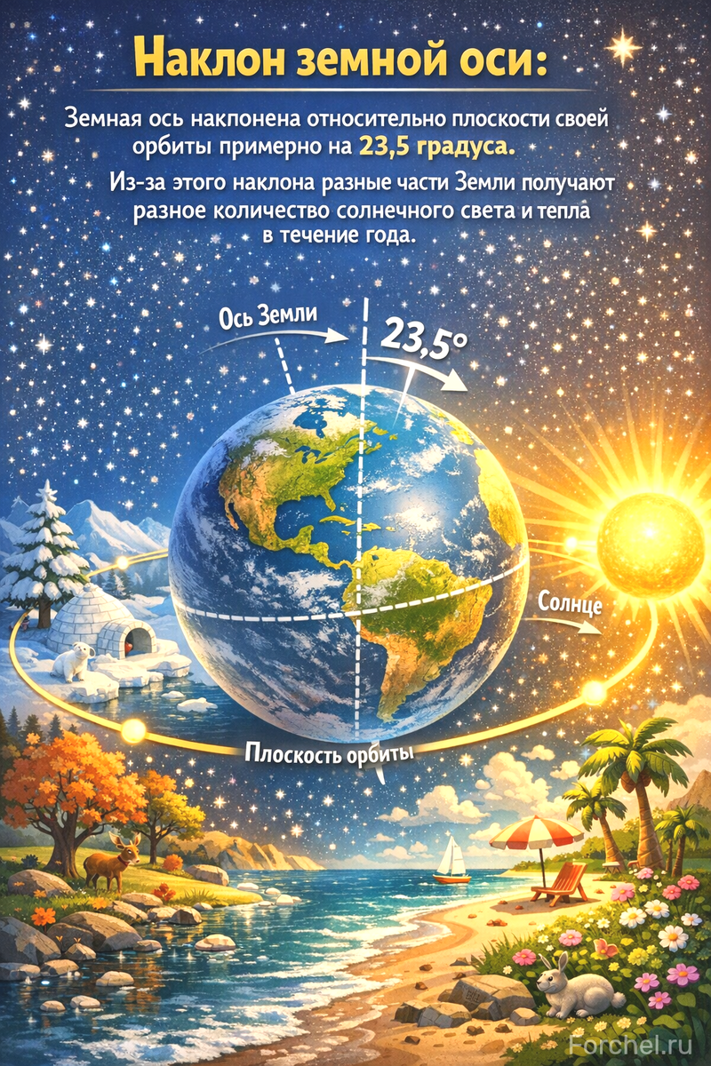 1. Наклон земной оси: Земная ось наклонена относительно плоскости своей орбиты примерно на 23,5 градуса. Из-за этого наклона разные части Земли получают разное количество солнечного