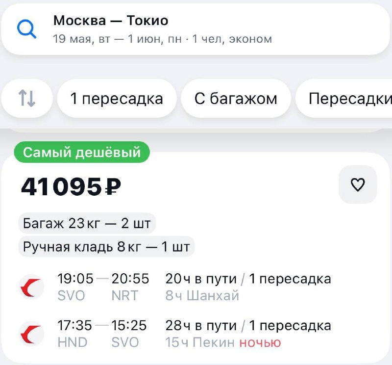 Москва – Токио от 41 095 ₽ с багажом 📅 Даты: 19 мая — 1 июня (вторник — понедельник) 🎒 Багаж: 2 места по 23 кг + ручная кладь 8 кг 🛫 Маршрут: ➤ Туда: 19:05 (SVO) – 20:55 (NRT), 20ч в пути / 1 пересадка ➤ Обратно: 17:35 (HND) – 15:25+1 (SVO), 28ч в пути / 1 пересадка (Обратно длинная стыковка в Пекине — 15 часов ночью) 🇯🇵 Почему Токио? Столица Японии — это город, где сакура соседствует с неоновыми вывесками, а древние храмы — с технологиями будущего. • Погулять по Синдзюку и Сибуя • Подняться на Tokyo Skytree • Попробовать суши на рыбном рынке Цукидзи • Погрузиться в атмосферу района Акихабара • Совершить однодневную поездку на Фудзи или в Камакуру 💰 Цена от 41 095 ₽ на человека в эконом-классе. --- #Токио #Япония #МоскваТокио #БилетДня #Авиабилеты #Май #Июнь #Путешествия #Багаж #Япония2024 #Турмеханика #turmexanika 📢 @turmexanika — ловим тарифы с пересадками и хорошим багажом.