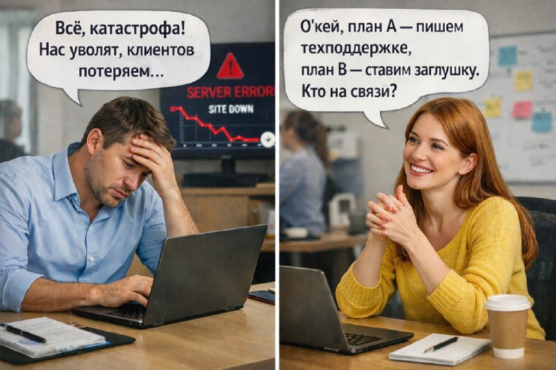 • Иван открывает ноутбук, громко вздыхает: «Всё, катастрофа! Нас уволят, клиентов потеряем».