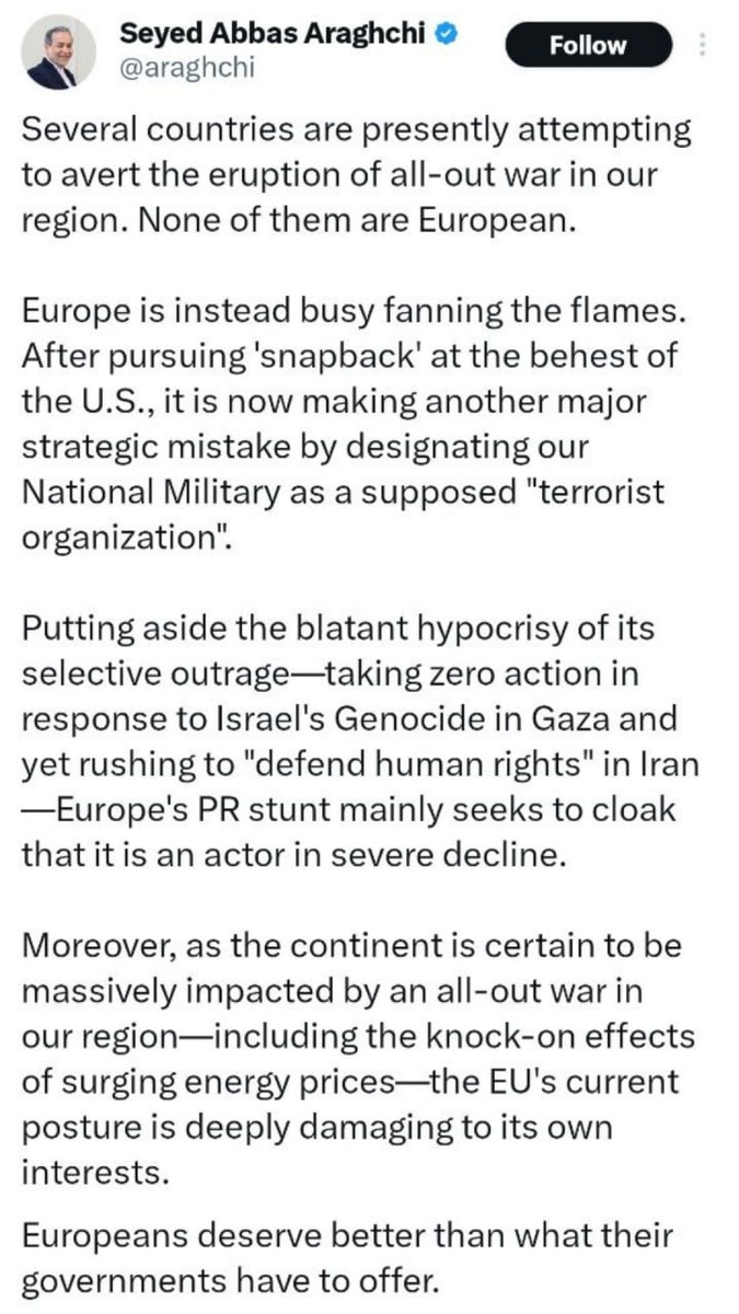 Iran RESPONDS to EU’s 'terror org' designation for IRGC 'Europe's PR stunt mainly seeks to cloak that it is an actor in severe DECLINE' — FM Araghchi 'Europeans deserve better than what their governments have to offer'
