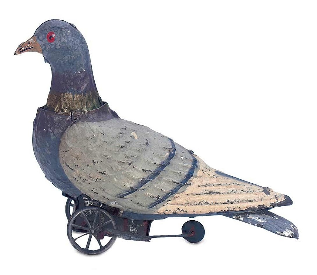 Обычно такого голубя отливали из жести или олова, расписывали вручную яркими, но уже слегка потускневшими от времени красками. Он стоит на круглой подставке с заводным ключом. Заведешь его — и начинается волшебство. Голубь не едет, а ритмично клюет зернышки на столе. Его головка на пружине опускается и поднимается с почти гипнотической регулярностью. Скрип шестеренок, тиканье механизма, монотонные, но живые движения — вот и вся анимация. Но для ребенка 1890-х это было чудом, равным по силе сегодняшнему роботу.