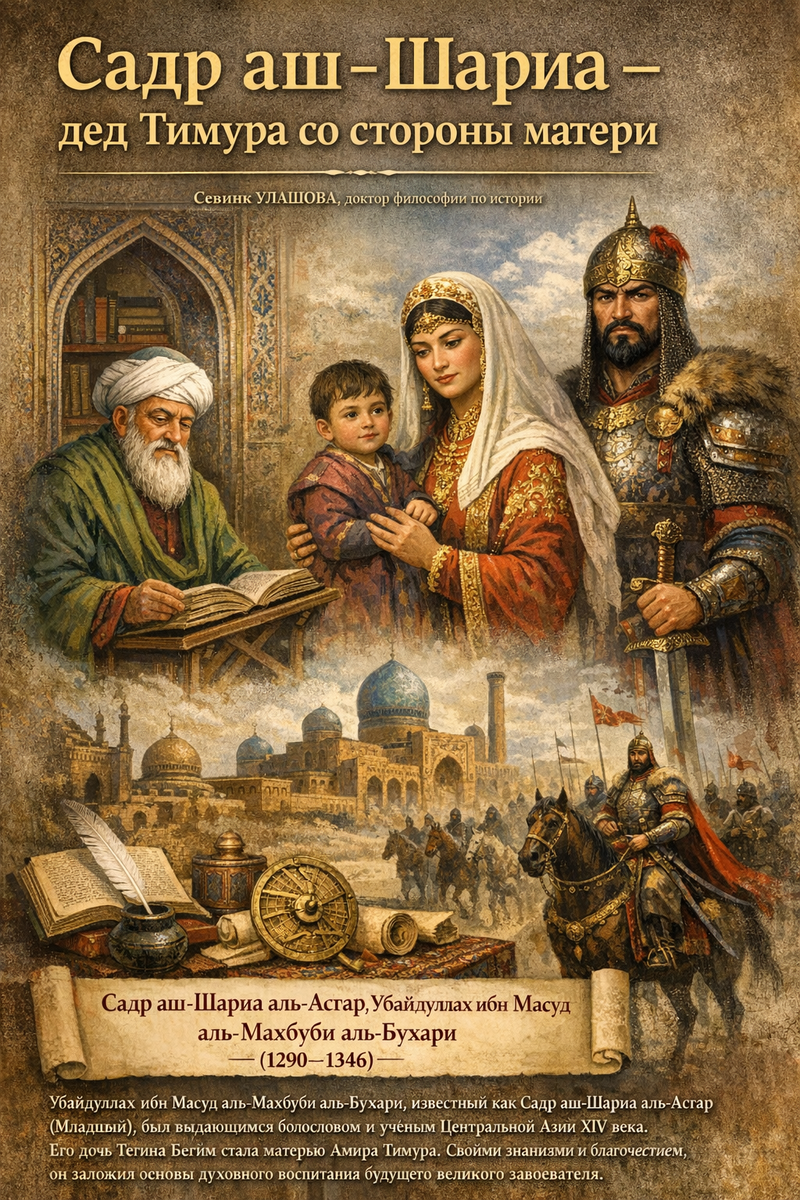 Когда мы говорим об Амире Темуре, чаще всего вспоминаем его как великого полководца и создателя могущественной империи. Однако за его военными победами стояли не только личные качества, но и мощная духовная и интеллектуальная среда, в которой он вырос. И здесь важную роль сыграла его материнская линия. Согласно большинству письменных источников, матерью Амира Темура была Тегина бегим (хатун). А его дедом по материнской линии — выдающийся богослов и учёный Бухары XIV века, известный под почётным титулом Садр аш-Шари‘а. Важно понимать: Садр аш-Шари‘а — это не личное имя, а высокий религиозно-научный титул, означающий «величие шариата». Его носили представители знатного учёного рода, поколения которых были признанными авторитетами в исламском праве. В источниках имя деда Темура передаётся по-разному: