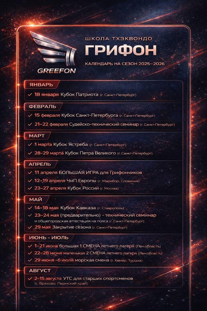 Календарь ключевых событий сезона 2026 в школе тхэквондо «Грифон