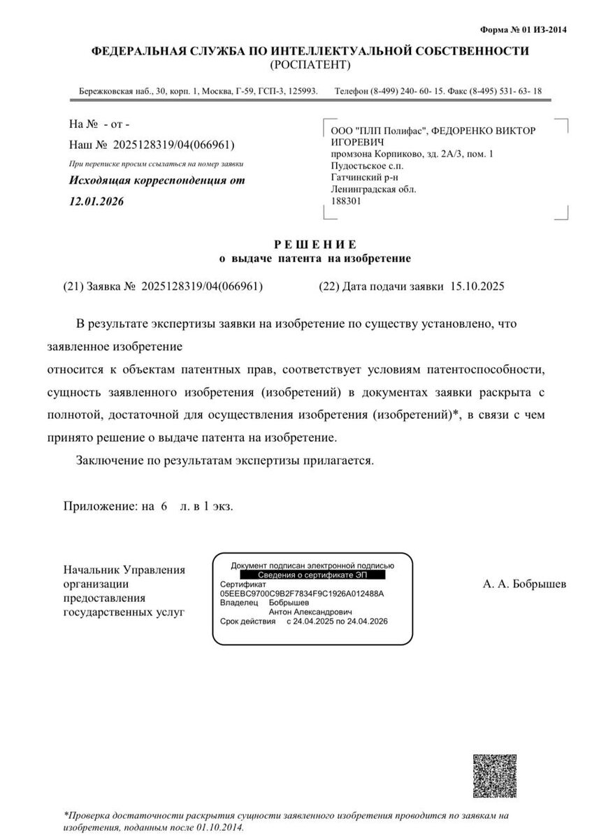 2026 год начался с рабочих, «железных» результатов. Помогли нашим клиентам официально закрепить права на три важные разработки. Это не про алгоритмы, а про материалы и конструкции, которые решают реальные задачи: