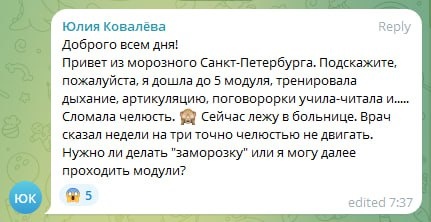 😂: ... я дошла до 5 модуля, тренировала дыхание, артикуляцию, поговорорки учила-читала и..... Сломала челюсть. 🙈 Сейчас лежу в больнице... "Шпасиба, курс харофый!"👍 PS: ни один студент во время прохождения курсов TSSS не пострадал. Автор просто каталась на горке с детьми и... в общем, так получилось 😄
