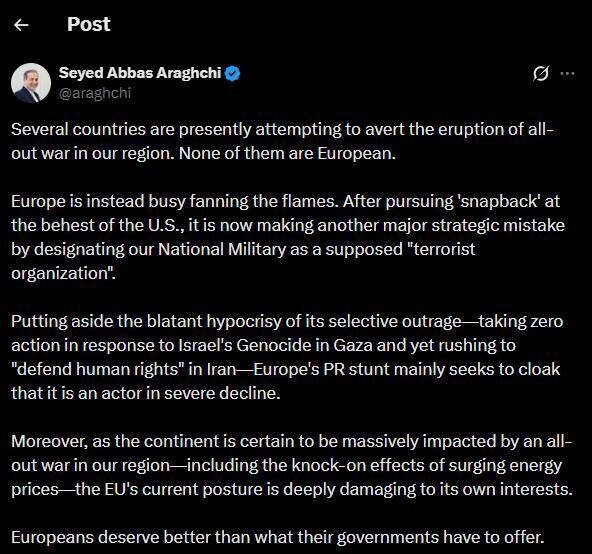 Министр иностранных дел Ирана Аббас Арагчи заявил, что европейские страны вместо попыток предотвратить большую войну лишь усугубляют ситуацию, действуя по указке США. По его словам, именно неевропейские государства сегодня стараются остановить эскалацию в регионе, тогда как ЕС продолжает делать стратегические ошибки — вплоть до признания национальных вооружённых сил Ирана «террористической организацией». Арагчи также указал на лицемерие Брюсселя: полное молчание о «геноциде в Газе» со стороны Израиля сочетается с показной заботой о «правах человека» в Иране. Министр подчеркнул, что подобная политика бьёт прежде всего по самой Европе — рост цен на энергоносители и последствия возможной большой войны неизбежно ударят по европейцам. «Европейцы заслуживают лучшего, чем то, что могут предложить им их правительства», — резюмировал Арагчи. Ранее глава МИД Венгрии Петер Сийярто заявил, что Европа жаждет эскалации войны.