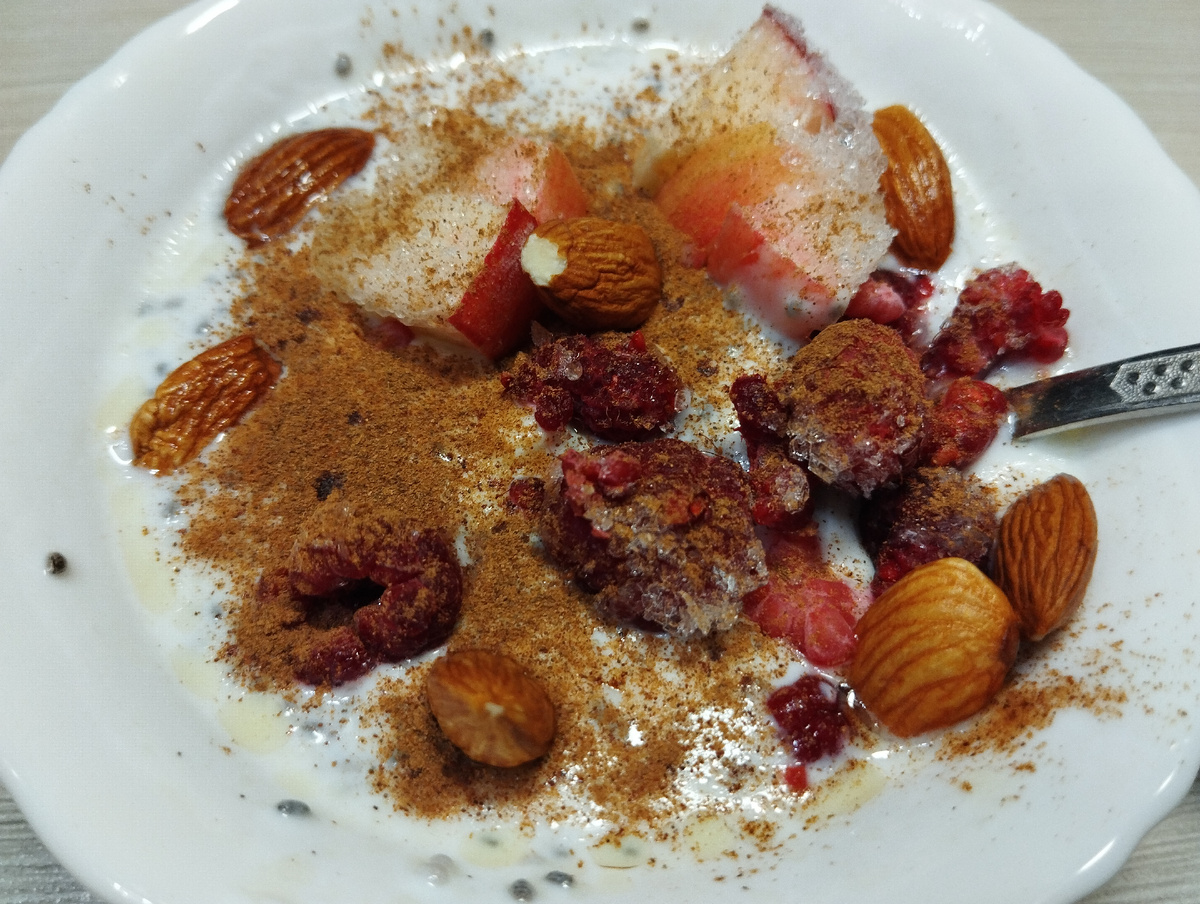 Здесь семена чиа, кефир, корица, ягоды и чуть орехов. Сытно, вкусно. Мне.