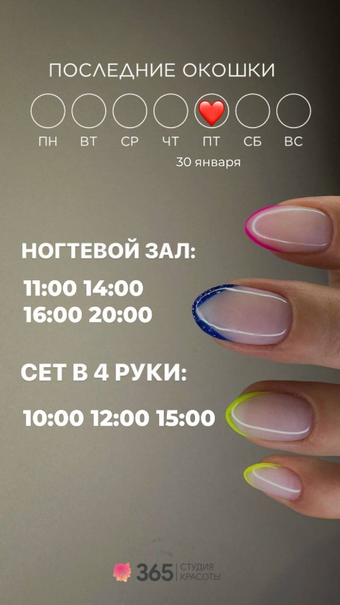 ❤ Наслаждайтесь уютом, заботой наших мастеров и будьте прекрасны каждый день ☀️😇 #красота #наслаждение #забота #зима #любовь  #мечты сбываются #радость #возможности ЧТО МОЖНО УСПЕТЬ СДЕЛАТЬ 30 января 2026 года : Ногтевой зал: 11:00 14:00 16:00 20:00 Сет в 4 руки: 10:00 12:00 15:00 Парикмахерский зал: ближайшая запись на 31 января Оформление бровей и ресниц: ближайшая запись на 5 февраля Косметология/шугаринг: ближайшая запись на 04 февраля ЗАПИСАТЬСЯ МОЖНО ЛЮБЫМ УДОБНЫМ СПОСОБОМ: 👉🏻 Сообщение в Whats'app https://wa.me/79663654477 👉🏻По телефону +79663654477 👉🏻Онлайн запись https://n286444.yclients.com/ #команда365 #красота #наслаждение #забота #зима #январь #любовь  #мечтысбываются #радость #возможности