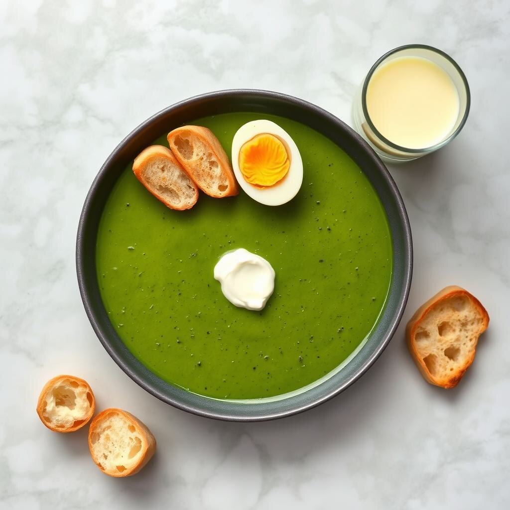 Особенность подачи — в финальном, почти алхимическом соединении. Отдельно готовится связующая смесь из яичных желтков и молока (или сливок). Эта заправка не вводится в общий котёл, а добавляется порционно в тарелку. На дно кладут половину или четверть яйца, сваренного вкрутую или в мешочек — его нейтральный, маслянистый белок и кремовый желток станут идеальным балансом для кислоты. Затем наливают яично-молочную смесь и уже поверх — зелёные щи. От тепла супа смесь слегка загустевает, обогащая каждый глоток нежной, сливочной полнотой, смягчая уколы щавелевой кислоты.