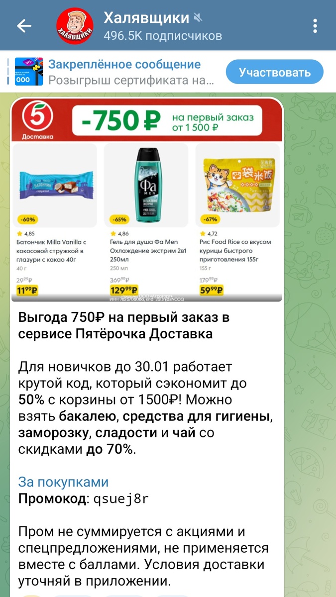 Недавно в телеграмме подписалась на один канал и там скидывают промокоды. Вчера там скинули промокод на 750 рублей при заказе от 1500 рублей в пятерочке на первый заказ.