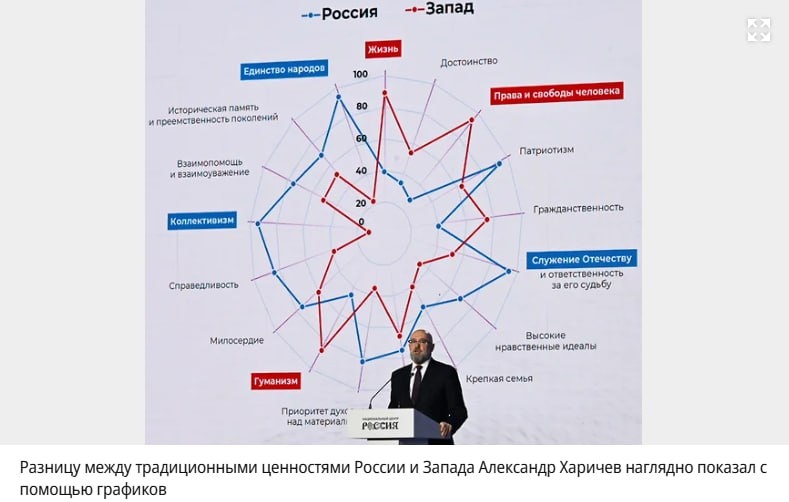 Новость двухмесячной давности, но все равно забавная и заслуживает внимания, поэтому прошу не кидаться тапками. Посмотрите лучше, чем нынче вершители судеб заняты! А у нас новый идеолог объявился, Александр Харичев. Попыталась погуглить, но даже поисковик выдал весьма лаконично – кремлевский идеолог. Из чего можно делать вывод, что, скорее всего, это очередной проходимец и шаромыжник. Зато он красиво выступил на каком-то затрапезном форуме. Нет, правда! Иначе я внимания не обратила бы. Он там такой заковыристый график презентовал, пентабазис называется, где наглядно показал все различия между традиционными ценностями гаранта и Запада. Да-да, именно в такой пропорции, потому что за всю Россию говорить не возьмусь. И знаете, что… Нескрепно так говорить, но мне, пожалуй, западные ценности ближе. Это, друзья мои, нормально, я считаю. Жизнь, права и свободы, гуманизм – прям все по списку, что я своим детям и внукам желаю, ни больше, ни меньше! А единство народа и коллективизм пускай гарант