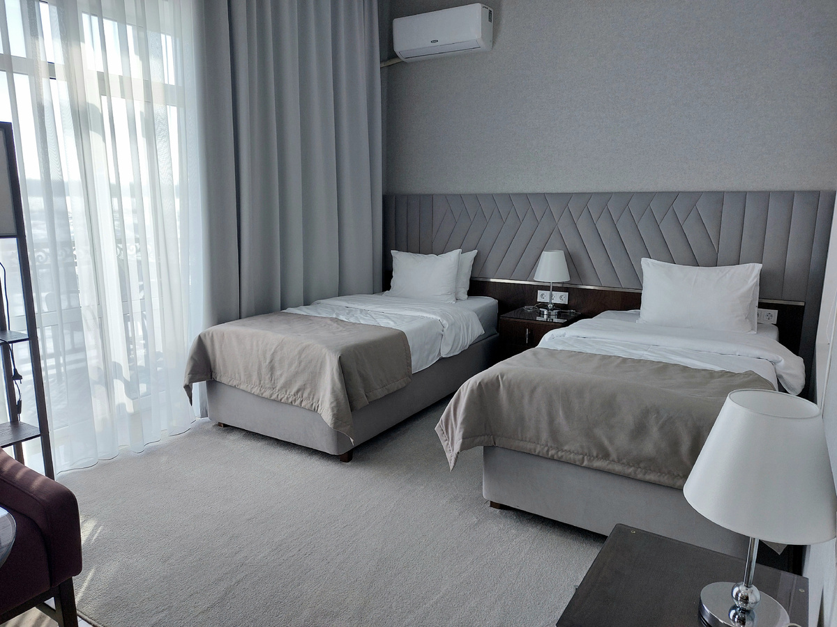 Наверное, это будет последняя публикация про поездку в санаторий города Лабинска Краснодарского края.. Все основные моменты про отдых рассказаны, осталось показать, где и в каких условиях мы жили, и как выглядит после ремонта термальный бассейн. Как мы попали в санаторий, я рассказывала в первой публикации, поэтому повторяться не буду. Жили по путевке тур выходного дня на вилле «Маргарита». Как мы попали, я рассказывала в первой публикации. В тур входит проживание, питание, пользование открытым бассейном, пользование закрытым бассейном 1 час и оздоровительные процедуры по дополнительному пакету. Еще можно по желанию пить воду из бювета в неограниченном количестве. Отдыхающие на виллах питаются в формате шведского стола. В прошлом году в апреле мы жили на вилле «Василиса». Меня приглашали для участия в фестивале «Я всё могу». Я должна была провести в рамках фестиваля мастер-класс, и нас с мужем и внуком разместили в таком же номере, только с совместной кроватью. Здесь в номере кровати