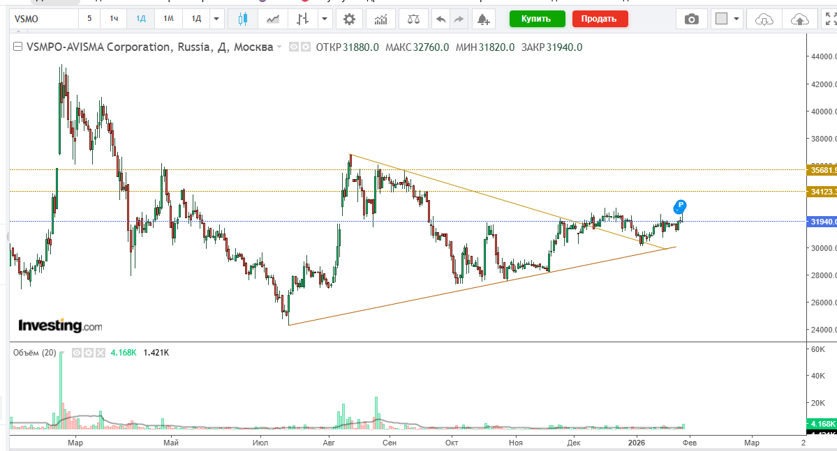Цветметы - новая нефть? А ведь цветметы - это не только литий и медь, это и титан с оловом. VSMO и ROLO Ну с ВСМПО АВИСМА всё более-менее понятно. Обычный треугольник, пробитый вверх. Вопрос только в том - когда начнет рост? Лежать в боковике после пробития треугольника можно долго.... А вот Русолово - тут есть место подозрениям и безудержным фантазиям. сильнейший удар вверх - на 50% за считанные дни - просто так не случается. Сейчас на столе 3 рабочие гипотезы: 1. куклы пампят. Сейчас разгрузятся - и вниз. Большой объем на продажу в последний день эту теорию подтверждает, вроде бы. 2. незавершенная пятиволновка. 3 волны уже прошли. Сеас будет 4я коррекционная, за ней 5я трендовая (вверх). Возможно - до 0,79. 3. мы видим формирование пика в комплексе "пик-волна". Сейчас быстренько вернется на 0,50, а затем медленно дорастет до 0,75. Все 3 гипотезы друг другу не противоречат и могут быть смешаны в любых сочетаниях. Ну, что дальше делать с этими графиками - это каждый решает лично в меру